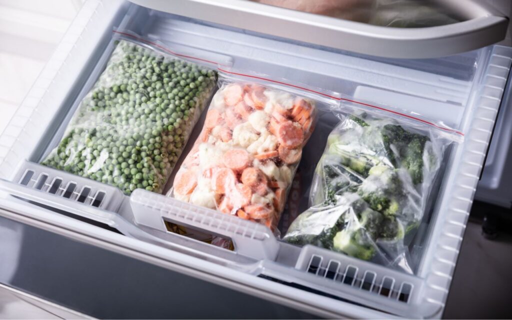 No freezer da geladeira, o ideal é guardar os alimentos congelados, antes de armazená-los, sendo importante verificar se o recipiente é resistente a baixas temperaturas. Isso porque, algumas embalagens plásticas e principalmente o vidro podem acabar estourando.
